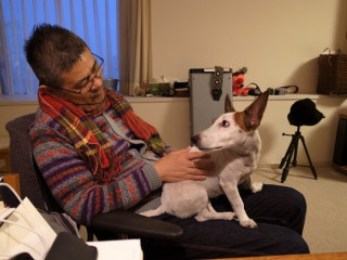 早く散歩に行きたい犬に、おとうさんが話しかけます。