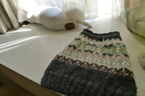 人間のおかあさんが編んでいた犬のあたらしいセーターが、もうじきできあがりです。