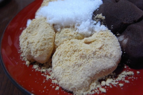 きなことあんこの甘いお餅と、山葵醤油で食べる(!)、辛み餅を1人前ずつ。