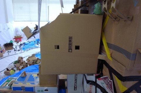 この作品に使われている段ボールや、いろんな材料は静岡の企業からいただいた廃棄物を再利用してるんですよー。