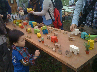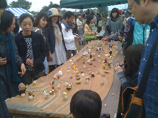 所用あってほんの少ししかいられなかったのですがついてから出るまでの間、こどもと二人、いろんなところを寄り道する感じで楽しんできました。 かわいい案内図をみつけてずーっとながめてたり、ブランコをしたり、木のどうぶつでたたかいごっこをしたり、お腹がすいた!とわめいてたこどももスコーンや小さいケーキで小腹を満たせてようやく満足。 さいごのお目当て、フルタショクドウさんのポテトのフリットに並んでたところでベイちゃんご夫妻と遭遇。 記念写真をとって 「もみじ市」とおわかれしました。 あー、もっとゆっくりできたらよかったなあ‥‥。 2010/10/24 14:37 |