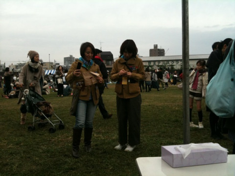 中継に夢中でまだ、お互いとなりにおそろいがいると気づいていないふたり。