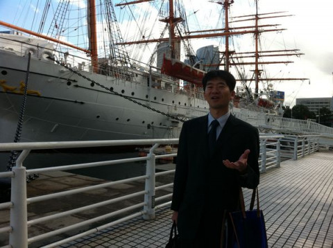 みなとみらい地区を歩きながら船旅の楽しさについて力説する山根。