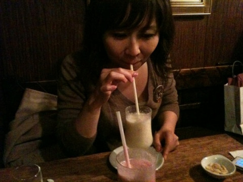 バナナジュースとイチゴジュースを交換しあいっこして、飲みます。