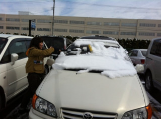 一ノ関の駐車場に停めてある社用車のフロントに雪が、デザイナー山川みちこが、それをとりのぞく。