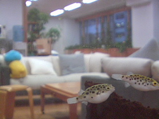 ナイスショット ーーーーーーーーーーーーーー 今日の夕方、こんなにハッキリしたフグさんが! しかも2匹で仲良く泳いでる〜。 結構ぼんやり映っていることが多いので、大興奮でした。 (R) ーーーーーーーーーーーーーー おぉ、お見事! いただく写真の中でもかなり綺麗な形でミドリフグさんがうつっている一枚だと思います。 水槽が大きくなったので、水槽の手前にいるか奥にいるかで、フグさんの大きさがかなり違いますね。 ちなみに左にうつっているのが、スーパームーンの彼です。 2012/05/16 14:11 |