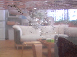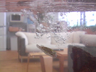 躍動感 ーーーーーーーーーー お掃除直後の泡で、フグさんがものすごいスピードで泳いでいるみたいに見えます。 (カスミ) ーーーーーーーーーー こんにちは、久々にフグさんに会えました! ダイナミックでしょ! (みみこ) ーーーーーーーーーー お、たしかに! ジェット機みたいに、後ろに煙りを残しながら前に進んでいるみたいですね。 水を替えている時は水位が一時的に低くなるのでろ過フィルターから出でている水がこうやって派手に泡をだすので、こういう感じになったのかと。 掃除は週一なので一週間に15分間くらいしか見られない珍しい場面です。 左上にズキューンって水を飛び出していっちゃいそうですね。 それは、困るぞ! 水の中でジェット機ごっこをしていてほしいものです。 2012/05/29 13:11 |