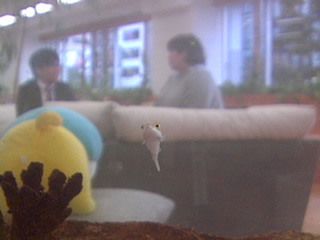 ふぐさんが足の生えかけた白いおたまじゃくしに変身してました。