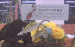 Synch ------------------------------以前クリスマスの時に紹介していただいて、二回目の投稿になります。 ほぼ日のみなさま海外からおかえりなさいませ。 久しぶりに会いにきたら、なんとシンクロしているふぐさんに会えました。 背景も生放送仕様で素敵です^o^------------------------------ ここ2週間ほどそわそわしっぱなしだった やっとこ、現実世界に戻りましたー。 ありがとうございます。 「おかえりなさい」って、すごくうれしいです。 いやぁ、さだまさしさん大変すばらしかったです。 涙をこらえながら舞台裏で色々やっているうちに、あっという間の3時間が過ぎてしまいました。 それにしてもフグさん、、、こんなシンクロは初めてです。 お花もあって、シンクロしてて、さださんもいて。 素敵な一枚だなぁ。 あ!そうだ。 先週は、平野レミさんの大江戸カレー も素敵だったのですよ。 いろいろ、なんというか、すごかった...。 動画が見られますので、ぜひともレミさんパワーをご覧あれ。 2015/03/17 12:05 |