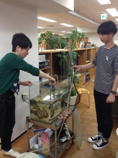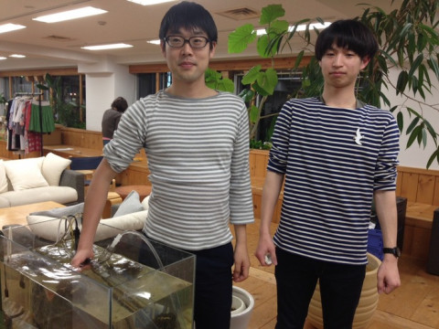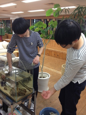 しゅんよさらば ------------------------------み、見られてる…! って感じがかわいい♪ (まんまる職人) ------------------------------ さてみなさん。 評議会を開きますよ。準備はよろしいですか? 問題は、(まんまる職人)さんのコメント 「かわいい♪」 が、しゅんくんとフグさんのどちらに対するものなのか、あるいはその両方に対するものなのか。 そいうことですよ。 いずれもこっちを見てますからね。 どっちがかわいいのか。それが問題なのです。 ここで参考としてもう一通。 (桜満開)さんのコメントをご覧ください。 ------------------------------逆光のふぐさんもかわいい〜 ・・・しゅんくんがいる・・・? (桜満開) ------------------------------ あぁ。もう決定的。 あきらかに、「かわいい〜」はフグさんのもの。 しゅんくんは、なんだかいるみたいですけど? みたいな? ま、そういうわけで、 二枚目のお写真をごらんください。 高橋さん(左)と、鈴木さん(右)です。 いきなり水槽掃除をさせていますね。 エサをあげたり掃除をしたり。 あとはいろんなイベントの時に登場するかもしれませんので、お見知り置きくださいね。 ところで、 その、3枚目の左手は、いったい何を伝えているところなの? 2015/04/14 19:15 |