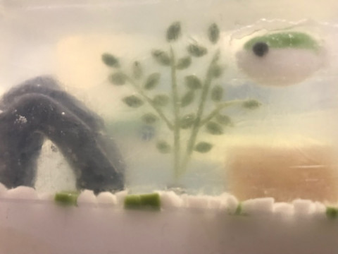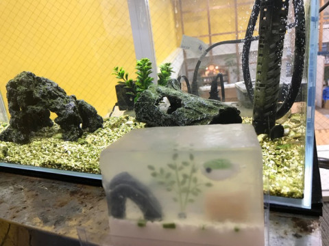 おどろきの完成度 昨日、 「フグです。」と言われました。 なんだろうと思ってみると、手の中に、フグが。 (例によって、びっくりしすぎて写真を撮り忘れました。) 1枚目の写真をご覧ください。 いつものフグカメラだと思いませんか。 2枚目の写真をご覧ください。 おわかりでしょうか。 これ、なんと。 「石けん」だそうです。 並べてみるとよくわかります、われらがフグはもちろんのこと、岩のトンネル、流木、水草まで、ばっちり再現されています! 水の透明度も。。。いやいや、きちんとキレイにしていて、今は水槽の方が透明です。 これはシノダの友人の方が手作りされたのだとか。 ほんのり石けんの香りがして、少し削って手洗いしてみると、当たり前ですが泡立ちました。 なんだか使うのがもったいないようにも思ってしまうのですが、使わせていただきます。 ありがとうございます! 会社は「生活のたのしみ展」や 「株主ミーティング」といったイベント盛りだくさんの11月を終え、生活のたのしみ展で先行販売してとっても好評をいただいた 「ほぼ日のアースボール」 「ほぼ日5年手帳」の販売も無事に迎えることができました。 予防接種があったりと、徐々に年末感が漂い始めています。 寒いので、風邪にご注意ください! 2017/12/01 17:16 |