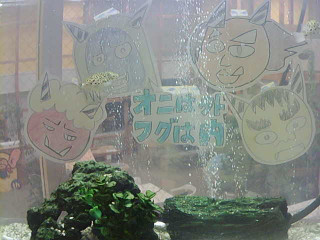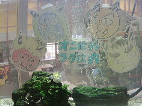 恒例フグはうち 1年前の反省を活かして (古いフグ投稿のリンクが貼れないので、気になる方はさかのぼってご覧ください) 今年は日曜日の節分でしたが、ばっちりオニを飾ることができました。 というか、このオニの生みの親 飾り具合をチェックしてると、さっそくフグが出てきてくれたので自分でも一枚写真をパチリ。 青オニに食べられそうなフグ。 ================================いつもフグに癒していただいております。 先週までの忙しい日々が過ぎ,今日も仕事が一段落して,久々にフグを見ようかとページを開いたら… フグが写ってる! 2匹にならないかなあと淡い期待を抱き,次の写真は… めっちゃ見られてる! でした。 鬼を追い払い,いい立春が迎えられそうです。 ありがとうございます。 これからも楽しみにしています。 あやぴぃ================================ 節分投稿をありがとうございます。 これは!めっちゃカメラ目線!! オニに負けないインパクトがあります。 ちょっとオニの仲間っぽくも見える。 オニは(水槽の)外!フグは(水槽の)内! よい立春に向けて2月、がんばろー! 2019/02/04 10:04 |
