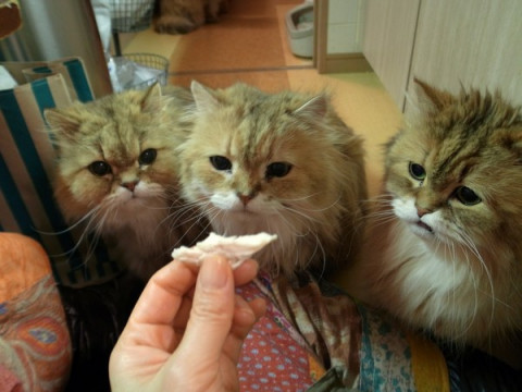 「ささみ」をじっとみつめる「ねこかぞく」。