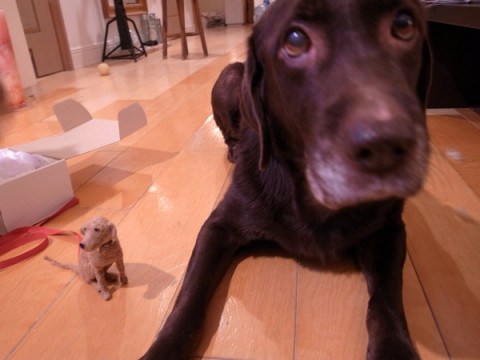 でもかわいそうなので、はなちゃんのにおいのついた、ほねの形のおもちゃをあげましたら、泣きそうなかおをして喜んでいました。