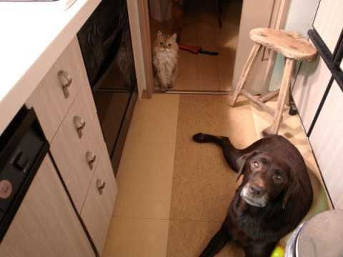このしゃしんは、ばあやが、はなちゃんたちのごはんの用意をしているときのしゃしんですがみんとは、かさかさ、と音がするとすぐ、くるのです。