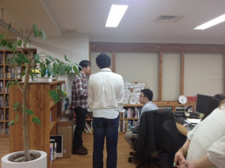 というのは大げさですが、まじめに、仕事の話をしているようです。