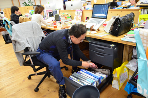 スタートの模様です。 月曜日に我々乗組員一同(含;社長)は、席替えのくじ引きをしました。 くじは、人に平等に運と仕事をもたらします。 ま、早い話、話が早いから席が近所の人と仕事をすることが多くなる、ということなんですが。 席の移動は金曜日に、ということになっていますが、もちろん、決まったら動きたくなるのが人情さ。 笠井さんが動き始めました。 「金曜日休みだからね。 迷惑かけないようにさ。」 と。 それもあろうかとおもいますが、弊社のせっかチーフ (せっかちのチーフ)ですから、その使命を帯びて、荷物整理中だと思います。 お〜い! みんな〜! 笠井さんが動くぞ〜! 2012/04/11 10:58 |