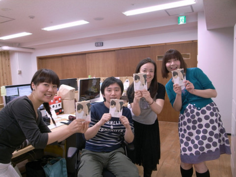 届いたよ! 本日より、「ほぼ日ストア」にて販売開始の『夜は待っている。』と 『ボールのようなことば。』。 できあがった『ボールのようなことば。』が、会社に先ほどたくさん届きました。 実物を前に、どよめく人々。 口から出る感想は、 「なんだか、この本、かわいい」。 手に収まる、いわゆる文庫本サイズ。 あと、色が、ほっこりぬくもりがあるような感じです。 栞もオレンジなんですねー。 じゃ、できあがった本と 記念撮影、ぱちり。 みなさん、よろしくねー。 2012/04/17 17:45 |