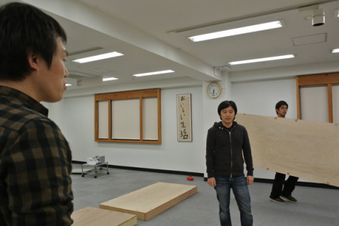 明日はライブ‥‥! こちら、ほぼ日の大ホールでございます。 明日20時より 大島保克さんのライブのUstream中継を行ないます。 これからセットの建て込みです。 今回のセットを担当する 山口工務店のメンバーは、左より笑顔悪魔・西田工務店リーダー・ぐっさんやる気の新米・順平の3人です。 まだ平面のセットですが (間に合うのか?) 3人の気合いがみなぎっています。 ところでこちらのページでは、現在大島保克さんのCDを販売しています。 3枚セット(島セット)で買うと生写真+大島さんのサインがついてきます。 金色のサインと銀色のサインです。 金の大島、銀の大島、どちらがお手もとにいくかはおまかせを。 3枚とも趣きがちがって、おすすめの名盤です。 2012/04/18 19:57 |