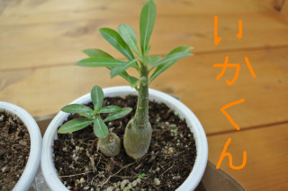 植物はじめました こんにちは、ほぼ日のスガノです。 最近、弊社の窓際で植物を育てています。 これは、 「砂漠の薔薇」と呼ばれる植物です。 3鉢あります。 ある方から、 「植物に名前をつけて育てるといいよ」 と教えていただいたのでこの3鉢にもそれぞれ名前をつけることにしました。 いちばん大きな鉢はガリガリくん。 中くらいの株はいかくん。 いちばん小さいのはあかぎくん。 そう呼びかけて、水をあげたり葉の泥を落としたりして毎日話しかけることにしました。 日のひかりを好むそうなのですが、水のやりすぎは禁物です。 元気に育ちますように。 2012/04/20 16:47 |