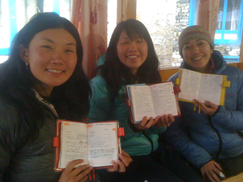 ほぼ日手帳、エベレスト街道へ。 2012年版のほぼ日手帳公式ガイドブックにご登場いただいたネパールの三牧さんからメールをいただきました。 青年海外協力隊員のお正月休みを利用してほぼ日手帳仲間とエベレスト街道に行ってきたんですって! ************** こんにちは。 ネパール三牧です。 日本の母よりほぼ日手帳スプリングが届きまして、お正月休みを利用して手帳と共にエベレスト街道のトレッキングにでかけました。 ほぼ日手帳愛用者3名でのトレッキングでした。 手帳に高山病の症状の悩みや、感動などを記入しながら登りました。 目的地5550mカラパタールへ無事登頂し、感無量の旅でした。 そして、下山の途中で、なんと石川直樹さんに出会ったのです! 一緒にお食事をさせていただきながら、ほぼ日の話や、いままでの冒険のお話を伺い、私たちの歩いて来たコースは石川さんにとっては散歩コースのようなもので、改めて冒険家のすごさを実感しました。 私たちの手帳の一頁にはこれからローツェ(エベレストより難しい山だそうです)にアタックする石川さんのサインが刻まれました。 世界は広くて狭いですね。 偶然ではありますが、同じ手帳に何を書いているのかお互い知らぬまま、何かを書き続ける不思議な同士の旅でした。 残り2ヶ月のネパール生活、精一杯ボランティア活動をしていきたいと思います。 私が本に載らなければ、ほぼ日手帳愛用者ともわからない仲間でした。 不思議な出会いのきっかけを頂いたことに感謝です。 ありがとうございました! 三牧由季(エベレスト街道の山小屋にて) ************** 富士山よりもはるか高い、5550mの地にほぼ日手帳を持ったメンバーが訪れ、そこで石川直樹さんに出会ったこと。 どれもすごい!と喜ばずにはいられません。 三牧さん、メールをありがとうございました! 残り2ヶ月の滞在も楽しんでくださいね。 2013年版のほぼ日手帳公式ガイドブックも絶賛進行中です。 がんばるぞぉ。 2012/04/23 20:57 |