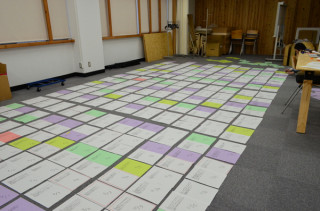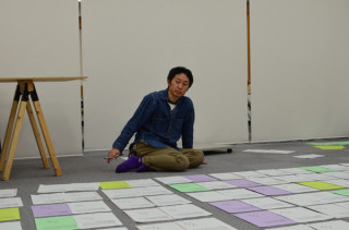 だいぶ前のことじゃった。 永田泰大は、またもや、床に紙をならべていた。 床に紙をならべるといえば、 「小さいことば」のシリーズだ。 ことしも、 「夜は、待っている。」のときにバリバリやっておった。 しかし、本はすでにできた。 今頃なにをしとるねん? 「今度は、手帳。」 つまり、「ほぼ日手帳」には365日「言葉」がはいっています。 この言葉は、毎年毎年泰大先生が、並べ替えているのでした。 2月22日はねこの日だから、ねこの言葉が入るとかね。 でも、毎年この方法じゃなかったよ。 「ことしはね、切羽詰まってるからね。 一気にやるのには、 これが一番なの。」 なるほどね。 ちなみに、「この床に並べて編集」という世にも稀なる方法で作業をすると 「ちょっと痩せる」らしい。 動きまわる量が半端ないのと、おかしな姿勢になって紙を並べたりするので、ヨガ的な効果もあるそうです。 2012/04/26 11:03 |
