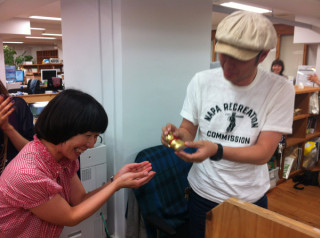 祝3000回 本日、「言いまつがい」が連載3000回を迎えました。 毎日毎日毎日毎日、更新してきましたこのコンテンツ、担当はもちろん ほんとうにすごい。尊敬する。 お祝いです、永田さん! 「この金のチョコレート、 おんどれの机にずっと飾ってあった やつでは‥‥?」 ま、いいじゃないですか。 おめでとう、3000回。 みんなは永田さんの背中を見て 「ありゃぁ、好きやから、できるんやなぁ」 と、あまり参考にせずこれまでやってきました。 はい、担当者がそのコーナーを好きだから、できるんです、3000回も! 「言いまつがい」はあしたから小ネタのコーナーで 「今日の言いまつがい」として生まれ変わります。たのしみです。 そうだよ、ずっとつづけばいい! それは、みんなが 「言いまつがい」を大好きだから! 乗組員一同: 「おめでとうーこれからもがんばれー」 2012/05/02 16:26 |