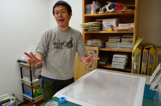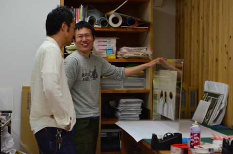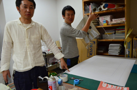 原画展の準備。 来週の月曜日、5/14から、表参道の交差点にある書店 「山陽堂」で、 「夜は、待っている。」と 「ボールのようなことば。」の 原画展を開催いたします。 それはつまり、酒井駒子さんと、松本大洋さんの表紙の原画をごらんいただく、という展示でございます。 もちろん、展示の準備はWEBページのデザインもしてくれた、山口工務店です。 原画をアクリル板にはさむ作業を慎重にしております。 この、はさむときの位置をプリントアウトして、下に敷いてから作業をするという、まことにもって、山口工務店らしい工夫が。 永田 「永田工務店だったら、 こうはいかないよ。 一回、はさんでネジでとめて、 だれかを呼んで、 『水平?』とか聞く。」 あ、この原画展、ただいま、全国を巡回すべく調整中でございます。 北や、西でも開催をめざしております。 2012/05/10 14:05 |