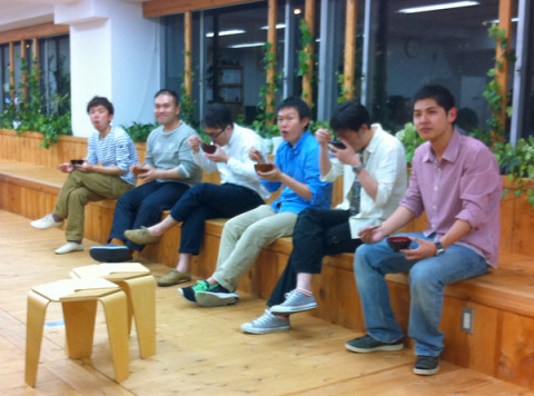 縁側に並んで食べる男衆も、満足そう。