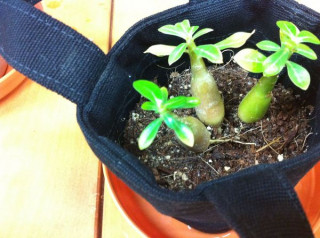 アルカイッ君 縁側植物係のスガノです。 金環日食出張が終わり、あたたかい季節になってまいりましたので、縁側の「砂漠のバラ」栽培にさらにいそしみたいと思います。 先週末、砂漠のバラの種をいただきました。 これを新たに植えようと思います。 何粒植えよう? 3粒にしてみました。 種を顔のように並べました。 (1枚目の写真) すこし、微笑んでいるみたいです。 名前を「アルカイッ君」にしようと思いました。 ほかの鉢もチェックします。 「あかぎ君」の根がグラグラしているのと、 「ガリガリ君」の葉っぱの色が変わりはじめているのが気になります。 水のやりすぎなのかなぁ。 2012/05/22 19:12 |