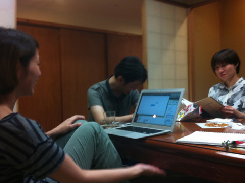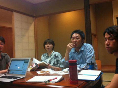和室 和室で打ち合わせするときは、たいていおやつを持ち寄ってしまいます。 今日も、申し合わせたようにひとりいっこずつ食べものをもってきました。 焼きそば味のベビースター、干し納豆、チーズ鱈、あんこのパン‥‥。 テーブルにティッシュを敷いて分け合う精神です。 おやつをつまみつつではありますが、話し合いは順調に進んでおります。 ちなみにこれら写真は、わたくし、座り位置から移動することなく、そのまま上体をそらし、腹筋を駆使して撮影いたしました。 1枚目の写真でみんなが微妙な表情をしているのは、そのためです。 2012/05/23 19:30 |