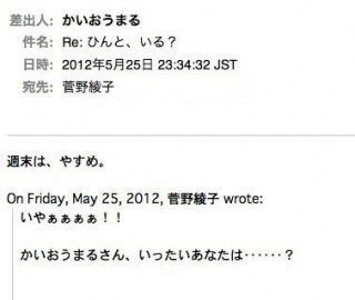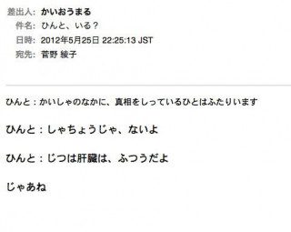 海王丸の謎10 みなさま 金曜の夜から解けない謎に挑んでおりますスガノです。 「まだわかってないのかい?」 そうなんです、ごめんなさい、まだわからないんです。 もう、私以外の全員が怪しい。 あのあと、金曜に「かいおうまる」から届いたメールをまずは2通、ご紹介しましょう。 ーーーーーー 件名:ひんと、いる? 本文:ひんと:かいしゃのなかに、真相をしっているひとはふたりいます ひんと:しゃちょうじゃ、ないよ ひんと:じつは肝臓は、ふつうだよ じゃあね ーーーーーー 件名:Re: ひんと、いる? 本文:週末は、やすめ。 ーーーーーー 今日出社したら、机の上の海王丸には週末疑われていた 「海王丸はサクラじゃないよ。 ちがうよちがうよほんとだよ」 というメモが貼ってありました。 そして、やってきた、次のメール‥‥。 2012/05/28 13:58 |