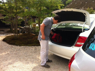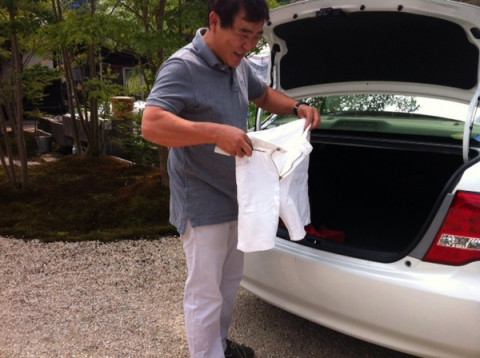 朝、集合したときは長ズボンだったのですが土楽に着くやいなや着替えてました。