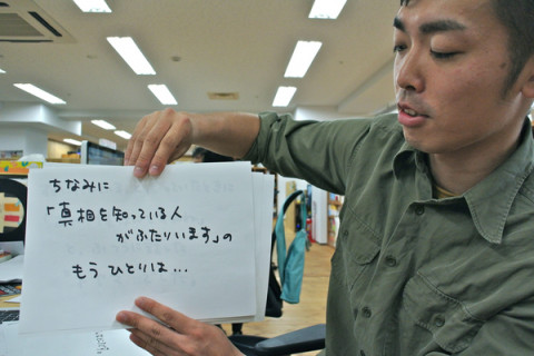 (解答編10) 共犯者は、共犯というよりも、ただ知っていた、という人物でした。 (ゆるっ) それは つまり、わたくしスガノは右隣の田中、お向かいの席のとやまにまんまとだまされて数日を過ごしたわけです。 読者のみなさんから158通の投票をいただきましたが、主犯の田中を当てた方はなんと、ゼロ。 そこで、共犯のとやまを選んだ方の中から抽選でプレゼントをお送りします。 (当選された方には改めて ご住所をうかがうメールを わたくしより出しますよ) 2012/05/30 16:13 |