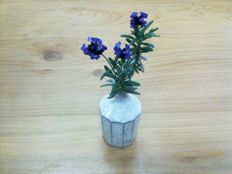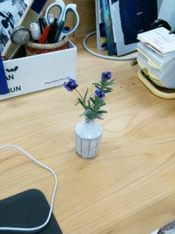 とともに自分たちの机に花を飾っているんですが、私の一輪挿しが空になっていたからと、今日はフジタがベランダに咲いていたというラベンダーを持ってきてくれました。