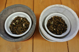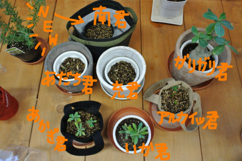 ぜんぶで7鉢 縁側植物係のスガノです。 砂漠のバラを、本日もひと鉢、増やしてみることにしました。 木曜日に種まきした 「あだち君」と「充君」は週明けに早くも芽を出しました。 梅雨とはいえ暖かくなってきているんですね。 ふたごのように育てようと思っていたのに、週末の日当たりに差が出てしまい、兄の「あだち君」のほうが育ちがよくなってしまいました。 かげひなたをつくってはいけない。 「充君」がんばれ。 今日増やした鉢は 「君づけだと『タッチ』じゃなくて 『南くんの恋人』になっちゃいますよ」 と言っていましたが、もうこれで、縁側植物も7鉢。 こまかいことにこだわってはいられません。 砂漠のバラ7鉢勢揃いで、暑い夏を迎えたいと思います。 2012/06/26 15:46 |