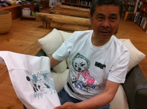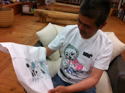 さきほどのゆーないとの投稿にありましたとおり、本日、えつこミュウゼさまにシルクスクリーン試し刷りふきんをいただきました我々、さっそく社長にも一枚渡すことにいたしました。