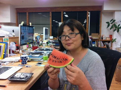 わぁ、それ、旗? かわいいな。あ、何か書いてある! あ、なるほどね。2013年版の 「ほぼ日手帳公式ガイドブック」の製作が佳境に入ったふじたへの応援だったんだね。 (「ギリシャが待ってる」というのは ギリシャLOVEのふじたにとって 最高の励ましフレーズなのだと わたしも、思います。) 最後に、スイカに癒されているある日のふじたもご紹介しておきます。 たしか、おとといは チョコミントアイスだったよね。 (彼女が選ぶ、癒し系おやつは なかなかのグッドセンスです。) 夏までもうすぐ〜。 2012/07/13 11:00 |