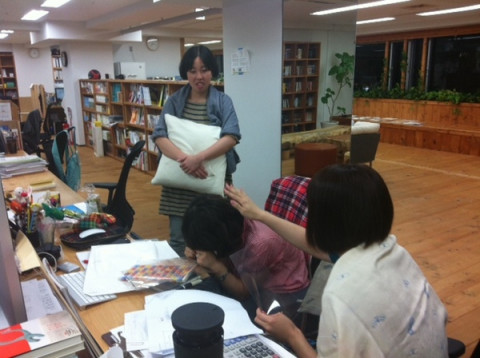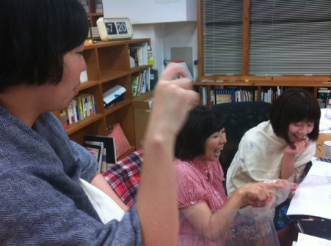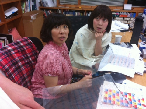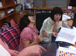 ハンヅラの箱。 同じ島の と言っています。 横で聞いていたデザイナーの 「わぁー、見たことのない下敷きがある」 と見て思ったことを、そのまま口に出して、ふたりに、ものすごくびっくりされています。 (写真2枚目) 版面(ハンヅラ)以外に、わたしが、聞き取れた単語は、級数、歯送り、行送り、段組、というようなことです。 これらの言葉を使って正しい文章を作る力はわたしにはありませんが写植の本を作っている、ということだけはわかりました。 いい本ができるといいなぁ。 2012/07/12 19:54 |