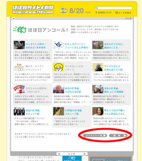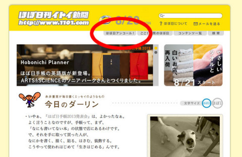 更新しましたよ。 あまりおしらせしたことなかったのですが、 「ほぼ日アンコール!」をさきほど更新しましたよ。 どこにあるかというと、 「ほぼ日」のホームにございます。 日付の下です。 こちらを、ぽちっとクリックするとびよ〜〜ん! とシャッターがおります。 ここに、ここ最近に終了したコンテンツのリストがあります。 しばらく「ほぼ日」をみていなくて、最近どうだったかなあ、なんていうときに、とても便利なのです。 こちら、オートマチックではなく、気がついた時に、ぼちぼち更新という、のんきなシステムではございますが、たまにのぞいてみていただければ〜。 そして、この「ほぼ日アンコール!」の下に 「コンテンツ一覧」「検索」 というリンクがあります。 こちらをクリックしていたくと、 「ほぼ日」14年とちょっとの間の、膨大なコンテンツが目の前に広がるかと! 底なし沼の様相でございますが、お暇なときに、ぜひどうぞ! 2012/08/20 18:35 |