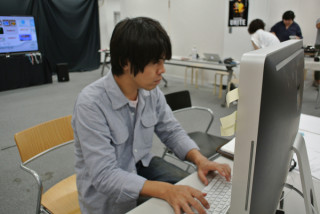 写真は、大音響のゲームプレイスを背に地道に「勉強ネタ」を更新する