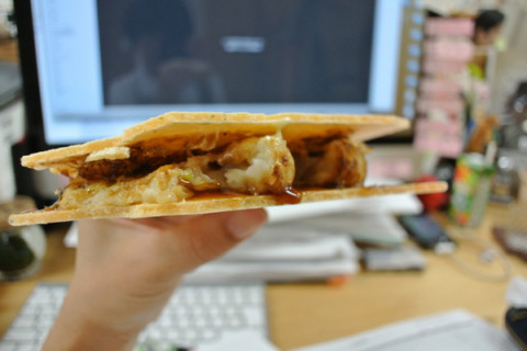 まりさフェアウェル 今日、アルバイトの (まりさの絵の髪型があまりに現在と ちがって、すみません) おむかいの雑貨屋さんのカフェで 「たこ焼き」を買い、コンビニエンスストアで 「えびせん」を買い、あとは 「たこせん」はできあがります。 まず「えびせん」をきれいにふたつに割ります。 (これは それから、ソースを、 「えびせん」のかけらを使って半月型の「えびせん」の1枚にきれいにすみずみまで伸ばします。 みちこマイスターのこだわりポイントです。 使用する「たこ焼き」はふたつ。 はさむときに少しだけキュッとつぶします。 2012/09/20 17:26 |