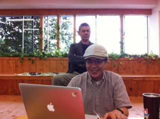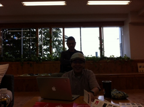 ミーティング中の山下さんのうしろで、仁王座りをする社長です。