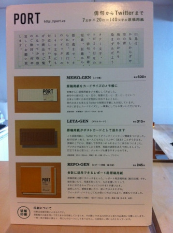 本日発売! 今日から発売するweeksアイテム、B印吉田さん代官山店舗限定のホワイトのウォレットカバー。 一目見たときから心うばわれ、お店に行って買おうと意気込んでむかいましたところ、なんと! 予約で初回分は完売とのこと! がーん。 でも店舗で引き続き予約は受け付けているそうなので、予約をお願いしました。 現物をみて、予約できるので確信をもって手に入れちゃいました。 続いて、すぎえ文具で取り扱いスタートしたPORTさんの商品。 原稿用紙のステキさを保ちつつ、140字というコンパクトさと、サッと書ける気軽さでたのしく使えそうなアイテムです。 ハガキやレポート用紙など種類もそれぞれありますよー。 今日から10月、手帳まわりはどんどんにぎわいますね。 2012/10/01 13:47 |