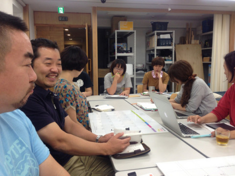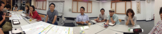 会議をとってみました。 昨日は、読み物を作る人とものを作る人との合同の会議名称を「大会議」がありました。 ツキイチの人数がたっぷり集まる会議です。 ここに登場いたしましたのは、 例のカバーをすごい勢いでつくっていると噂のiPhone5で撮影したパノラマ写真です。 長机の人々をまんべんなくうつそうとおもったら、これにかぎるでしょー。 とおもって、やったのですが、案外むつかしくて、写ってない人もいるねえ‥‥。 パノラマといえば、写ルンですのパノラマというのがむかしはありましたなあ。 2012/10/02 11:12 |