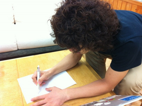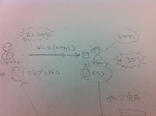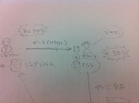 オカム 今日は集中して作業しなくてはいけないことがあり、テレビ前のソファーに陣取っているわたくしです。 (社内のみなさん、すみません) でも、その作業もそろそろ終わり、次の仕事に入らねば‥‥と思っているところにオカムラがやってきました。 「スガノさん、もしかして、ぼくを 待っていますよね」 あ、いままで自分の仕事で手一杯だったけどそうだ、そういえば、オカムの作業待ちのことがひとつあるんだった。 「でもですね、ぼくの前に つまり、さわやなぎさんを待って、 ぼくを待って、そこから練習して、 テストしてフィードバックして完成です」 今日中に? 「今日中に」 図に書いてくださいますか。 「さわやなぎジャブシステムができて、 それをHTML化して、CSSをつくって ページ完成。 それでやっとブラウザで見られます。 スガノさんはフォームに書き込んで、 それを練習。それから、フィードバック」 今日中に? 「今日中に」 2012/10/02 20:48 |