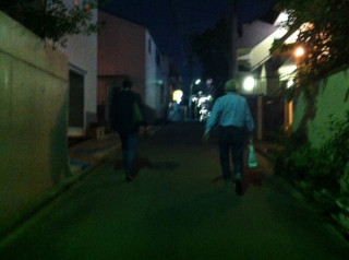 和田誠さんと松家仁之さんといっしょに、夜の町を歩いています。