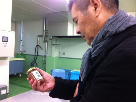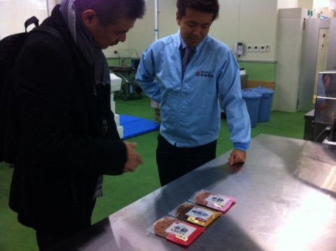 波座物産さんの塩辛の新しいパッケージを見せていただいています。