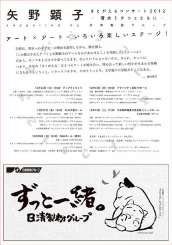 矢野顕子さんのコンサート情報です! 気仙沼での「音楽の稽古場」を今月16日にひかえている矢野顕子さん。 じつはきょうから、年末恒例の 「さとがえるコンサート」がはじまるのです! ことしの「さとがえる」は、なんと、清水ミチコさんとの共演。 いったいどういうコンサートになるのかまったく知らずにおりますが、 「たのしいもの」になることはきっとまちがいなさそうです。 スケジュールの詳細は、こちらをどうぞ。 当日券情報については、各コンサートの問い合わせ先にどうぞ。 (大きなフライヤーは、こちらからからどうぞ!) さて、この「さとがえる」に、 「ほぼ日」でもおなじみの、あのかたが、かかわっているのです。 そのかたとは‥‥。(つづきます) 2012/12/04 13:21 |