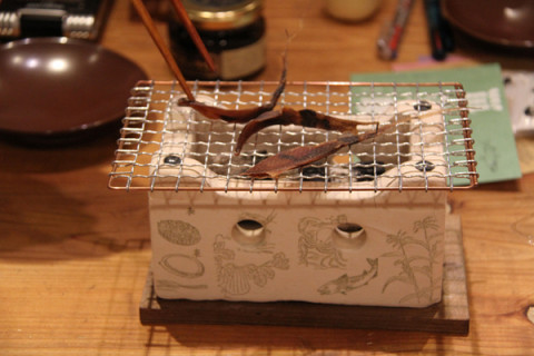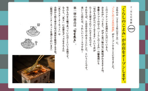 「炙りスターターキット」。 そういえば、1年で72ある季節の変わり目に更新する、 くらしのこよみのニュースの部分に、先月くらいから告知しているものがありました。 (ほぼ日ニュースでも とりあげてましたね。) それは 「炙りスターターキット」。 気軽に家で、旬の食材を炙って食べることができる、いわゆる、大変優れたミニ炙りセットです。 という話になりまして、 炙りました。 炙りましたよ。 ひと言で言いますと、大変幸せな打ち合わせでした。 コンパクトな七輪ですが、火をおこした炭を入れるとそのまわりの空気もじんわりあたたかくなり、食材も思っていた以上に早く炙れます。 干しほたるいかに始まり、干甘エビ、ぎんなん、海苔、ししゃも などなど。 炙りに炙ってちびちび食べながら、 くらしのこよみについて話したのです。 ああ、楽しかったなぁ。 ちなみに、炭は 「くぬぎ炭」というものを使用しており、火つきもよく火力もあり、 (今回は打ち合わせの冒頭に炭に火をつけて そのあとずっと最後まで炙り続けることが できました) 煙も出にくいので屋内の使用にも最適かと思います。 炭に火をおこす火起こし器なども一式ついていますので家にガスコンロさえあれば十分に炙りを楽しめます。 たぶん、お正月とか、けっこう盛り上がるのではないかと思います。 それでは引き続き、 くらしのこよみ(「ほぼ日」ver.)と 本のくらしのこよみと、 アプリのくらしのこよみと、 うつくしいくらし方研究所共々、どうぞよろしくお願いいたします! 2012/12/07 12:06 |